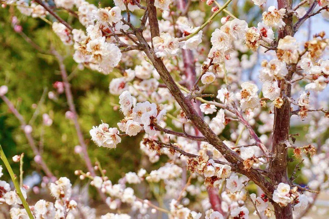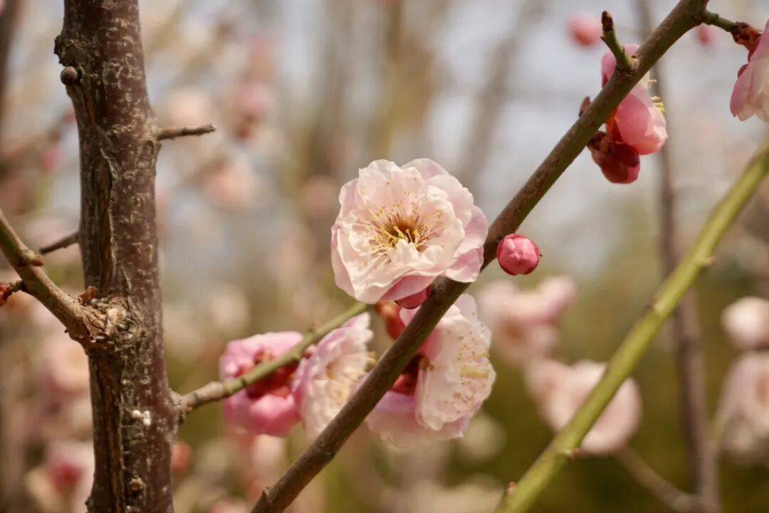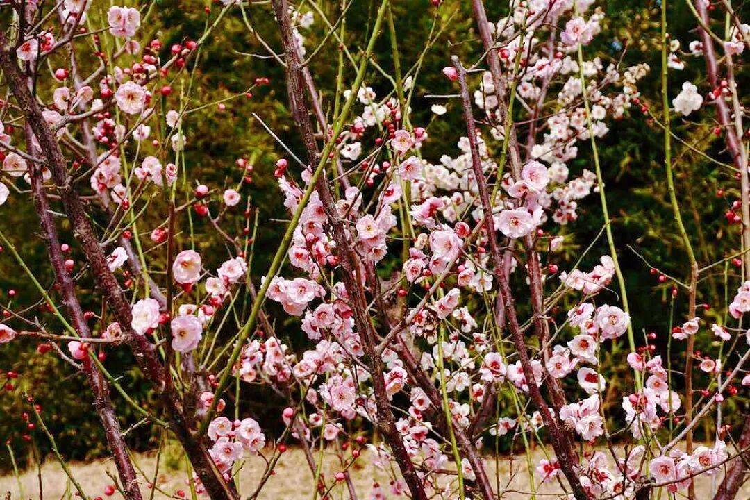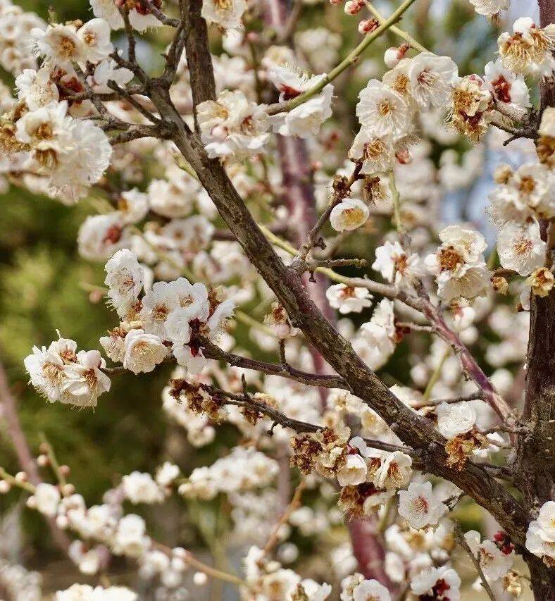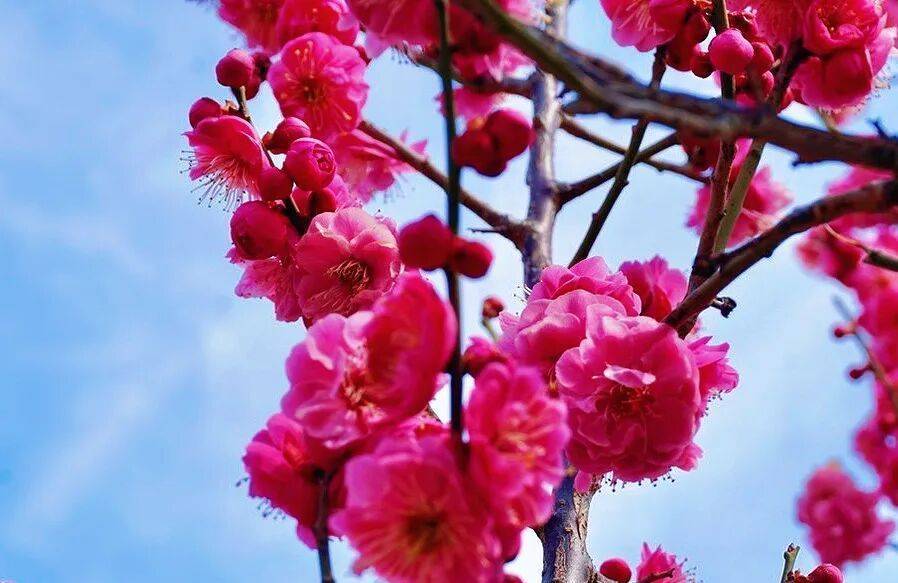 走近细看,枝端的梅花挨挨挤挤,晕染出浅深不一的春色:艳红似火、粉白若雪、柔粉如霞,层层花瓣交汇相拥,在蓝天碧海的烘托下,勾画出一幅灵动的春日水墨图。