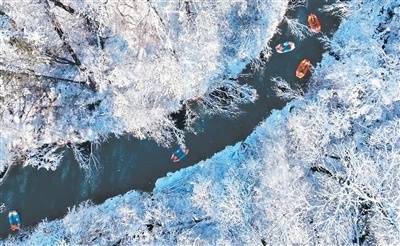 新年起头,吉林省白山市抚松县露珠河狩猎度假区内,冬季雾凇飞动热度不减。度假区的河流在冬季也能保持零摄氏度以上,蒸腾的水汽在两岸树枝上结成冰晶,远瞭望去,万树银花。旅客顺流而下,伸手便能摸到雾凇,“自然天气冷,但这树上的雾凇,真的新奇,不虚此行。”江苏旅客陈先生说。