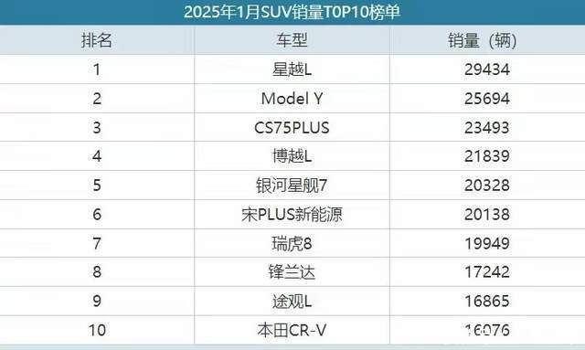 2025年1月,国内SUV市集在春节假期与耗尽不雅望激情重叠的布景下,呈现出“自主领跑、油电博弈”的权贵特征。尽管乘用车举座销量同比下滑,但SUV细分市集以50%的销量占比展现了较强韧性,近期1月SUV车型的销量数据仍是发布,接下来咱们就来望望各款车型的施展吧。