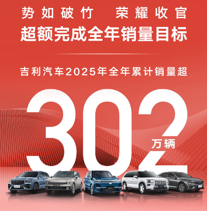 其以全年302万台的销量收官,比拟于24年,销量增幅39%,逾额完成了300万年销量指标,是竞争蛮横的25年最告成的一家大型汽车集团。