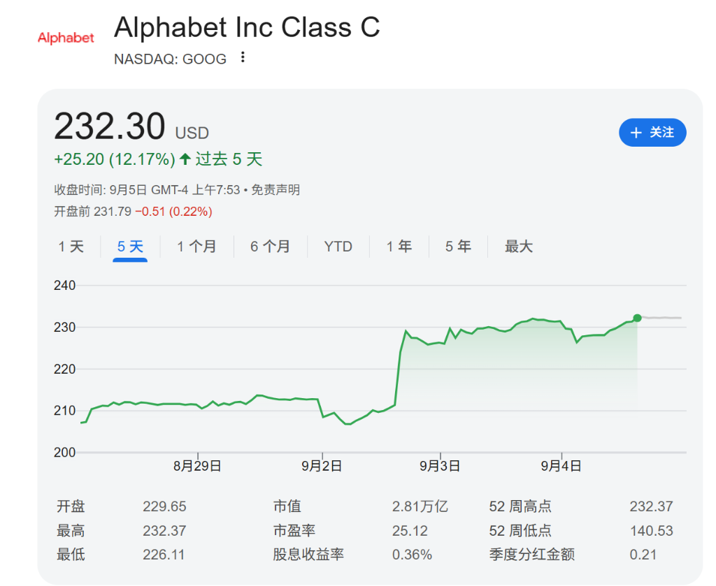 在旷日捏久的反把持阴雨散去后,谷歌的股价倏得挣脱了拘谨。一项关键裁决的落地,为这家科技巨头扫清了数月来压制其股价的中枢风险,使其距离3万亿好意思元市值这一历史性里程碑仅一步之遥。