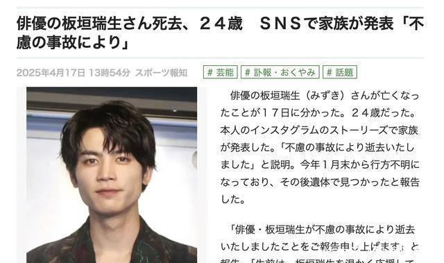 板垣瑞生的家东谈主对其离世历程作出领悟:自旧年起,板垣瑞生便受精神疾病困扰。本年1月底开动,他不幸失散。在警方以及一又友们的匡助下,家东谈主们耐久未尝毁灭搜寻。就在近日,警方奉告家属,于东京都内发现了他的遗体。