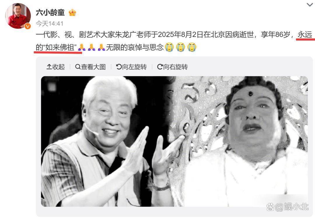 现如今朱广龙先生离世后,曾与其一皆在86版《西纪行》中出演过孙悟空的六小龄童,也发文诟谇称其是:长期的“如来佛祖”。