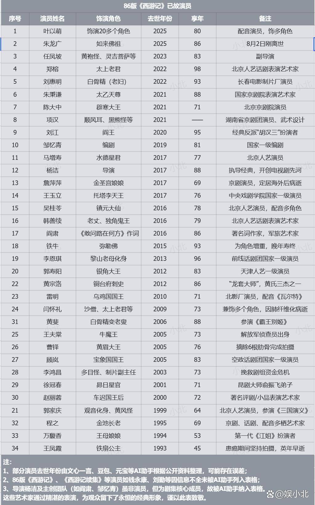 其实,在86版《西纪行》播出的39年里,因病离世或是寿终正寝的演员就已经多达33位。