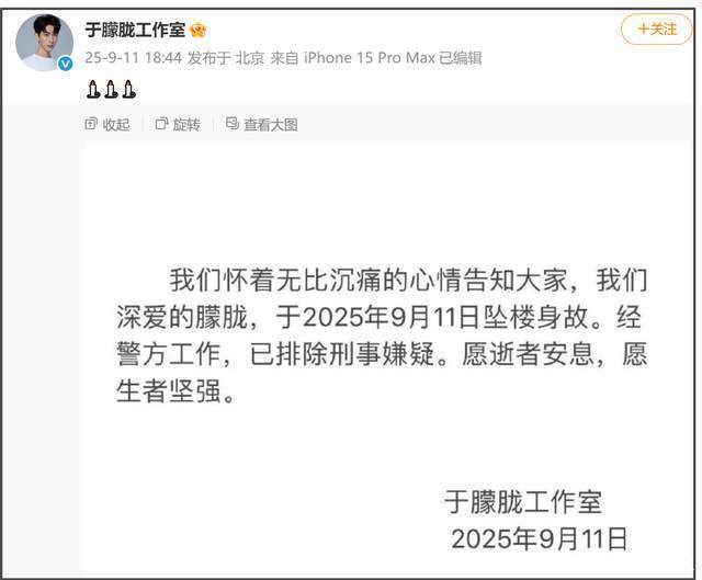 当今责任室照旧发文证明恶耗,暗示:“咱们怀着无比千里痛的状貌奉告巨匠,咱们敬爱的隐约,于2025年9月11日坠楼身死。经警方责任,已摒弃刑事嫌疑。愿骸骨安息,愿生者强项。”