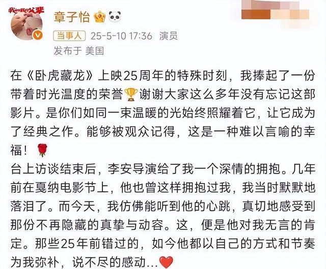 这片子对她来说是回荡点,但历程真不打发。李安为了让她剖析后劲,迥殊不给她太多细目,当年拍戏时候,他抱周润发、抱杨紫琼,即是不抱她。直到罢了宴,李安才给了她一个拥抱。她其后回忆,说那时候年青,异常珍惜导演的招供。 转瞬25年往时,2025年5月9日,在洛杉矶奥斯卡博物馆,重映行径上,李安和她又碰面了。两东谈主聊了40分钟,共享回忆。李安说这部片是他糊口最难的,预算紧,武打复杂。 行径限度,李安主动走往时,给了她一个长达20秒的拥抱。她过后在外交平台上发文,说这个拥抱让她念念起当年,感动得掉泪。这事闹得挺大,全网皆刷屏了,群众以为这25年的恭候,终于圆满了。