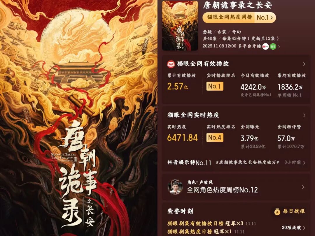 《唐诡3》不愧是万众期待的白蟾光,刚播4天就累计播放破2.5亿,平台热度破万,好评一波接一波。