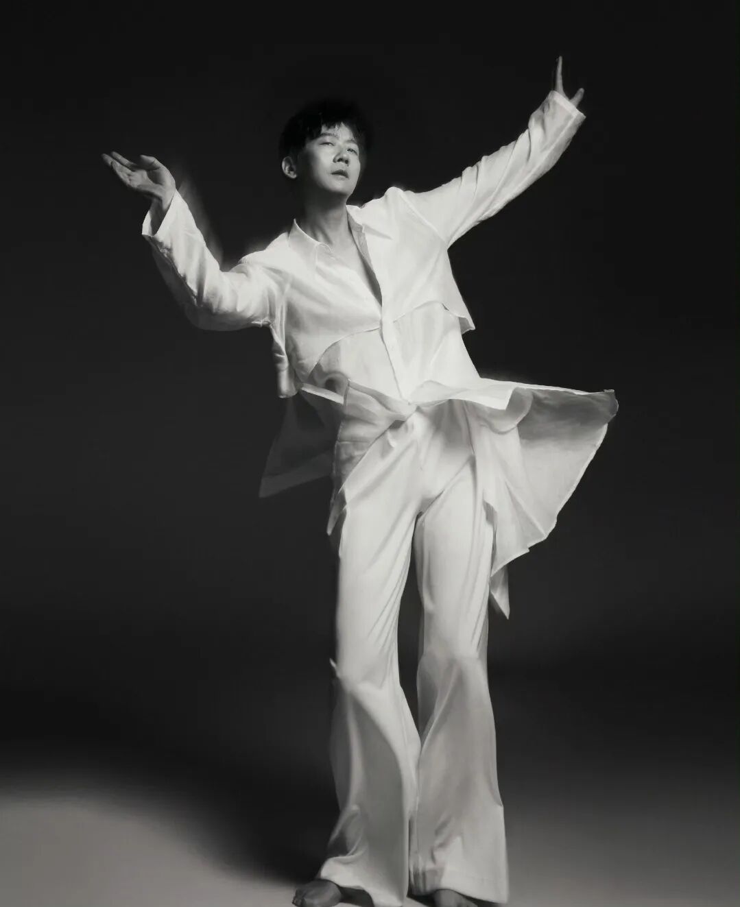 纯白色是丝质衣衫随他舞步飘飖,趁的他有一种柔好意思之感。