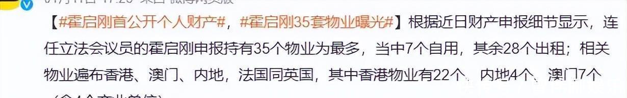 前不久,霍启刚晒出了我方的财产清单,一共领有35个物业,香港那里有22套,内地4套,澳门7套,法国有1套自住用,英国还有1套出租的。