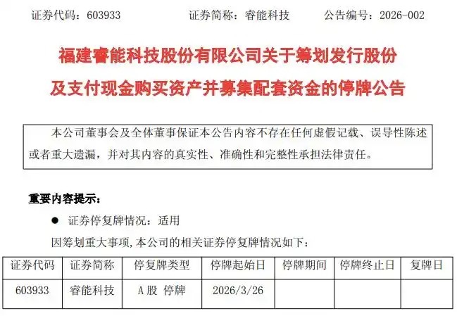 3月25日晚间,睿能科技(603933.SH)公告称,公司正在贪图通过刊行A 股股份和支付现款相连结的阵势收购博泰智能装备(广东)有限公司(以下简称“博泰智能”或“方向公司”)失当先75%的股权,以获取其限制权,并召募配套资金(以下简称“本次来往”)。鉴于事项存在不细目性,为珍贵投资者利益,公司股票自2026年3月26日起停牌,预测停牌失当先10个来畴昔。