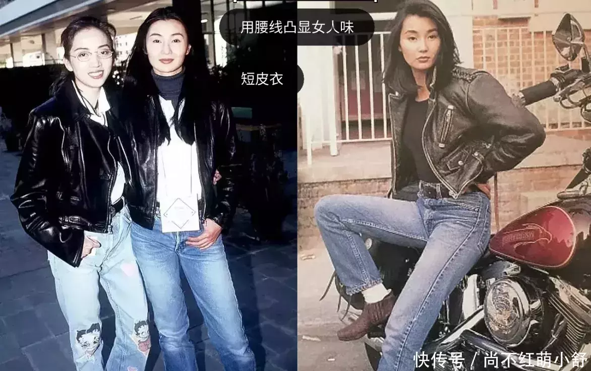 首选直筒高腰裤,搭配短款皮衣或衬衫T恤,下摆打结炫耀腰线,效法梅艳芳和张曼玉同框下的的慵懒性感。破洞筹划需当然磨白,幸免过度夸张。