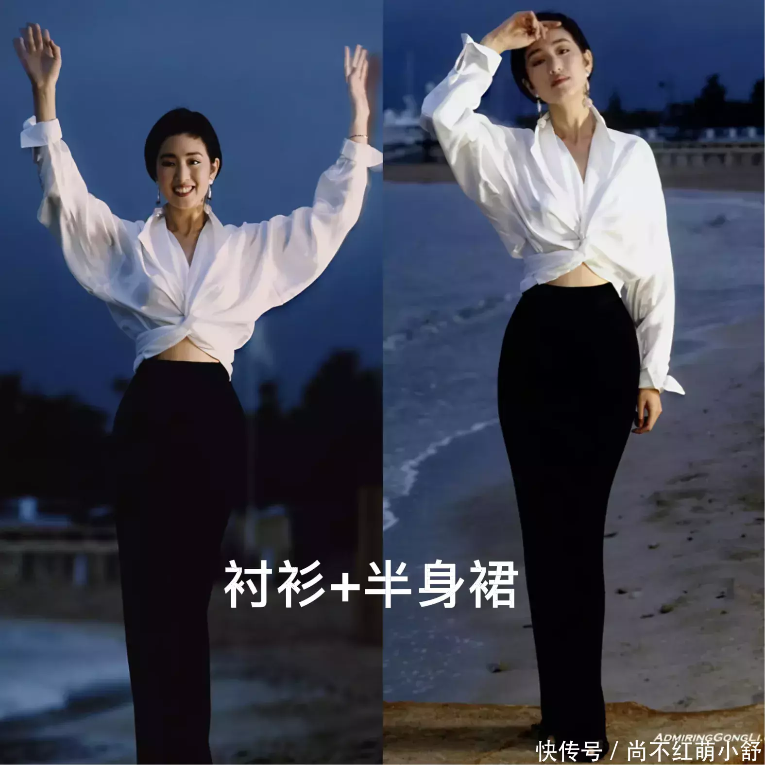 衬衫除了搭配裤装,还不错搭配裙装。瞧巩俐在1993年穿的这一套也太顺眼了吧,衬衫璷黫打一个结,口舌经典配色,虽节约却很是高等,完好展现了女性的东方之好意思和弧线之好意思。