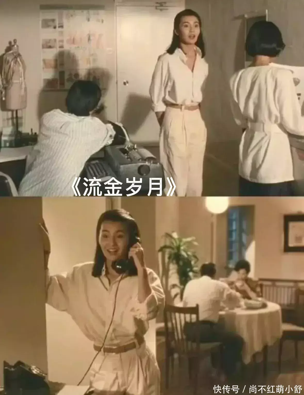 张曼玉在1988年《流金岁月》剧照中,穿了一件白色衬衫配西装裤,搭配棕色腰带勾画腰线。