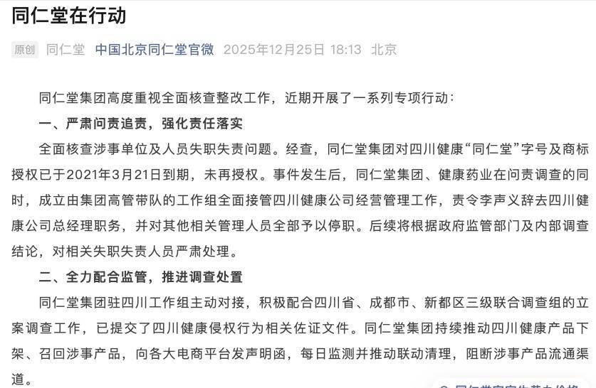 12月25日晚,同仁堂集团官方微信公众号发文称,该集团高度心疼全面核查整改职责,近期开展了一系列专项行径,包括全面核查涉事单元及东说念主员黩职失责怪题,责令李声义辞去四川健康公司总司理职务体育游戏app平台,并对其他有关护士东说念主员一说念赐与停职。后续将凭据政府监管部门及里面探听论断,对有关黩职失责东说念主员严肃处理。