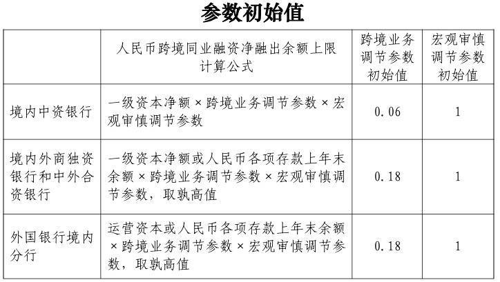 对于境内中资银行,东说念主民币跨境同行融资净融出余额上限=一级老本净额×跨境业务波折参数×宏不雅审慎波折参数。