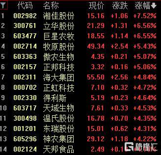 猪肉板块走高,湘佳股份涨超7%,立华股份、巨星农牧涨超6%,牧原股份涨超5%。