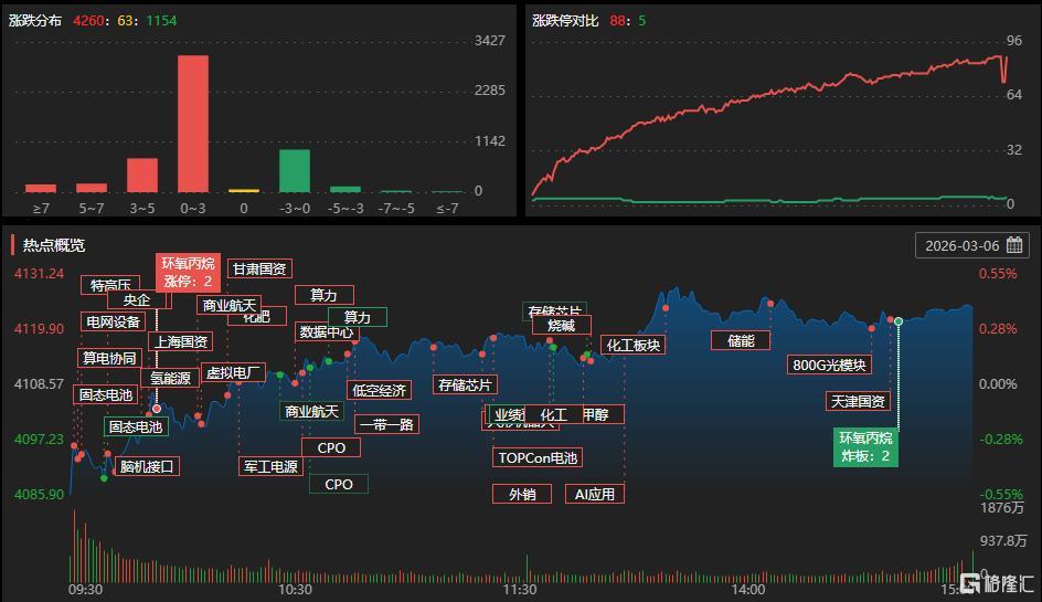 3月6日,A股三大指数集体高潮,摈弃收盘,沪指涨0.38%报4124点,深证成指涨0.59%,创业板指涨0.38%。全市集成交额2.22万亿元,较前一往畴昔缩量1933亿元,超4200股高潮。