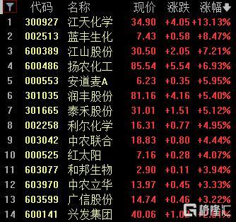 草甘膦板块大涨,江天化学涨超13%,蓝丰生化涨超8%,山河股份涨超7%,扬农化工涨超6%。