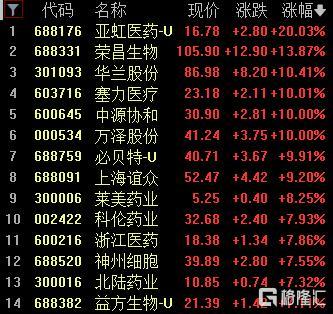 立异药板块反弹,亚虹医药20cm涨停,荣昌生物涨超13%,华兰股份涨超10%,塞力医疗涨停。