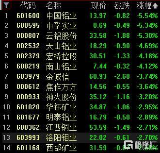 工业金属板块走低,中国铝业、中孚实业、云铝股份跌超5%,天山铝业、宏桥控股、南山铝业跌超4%。
